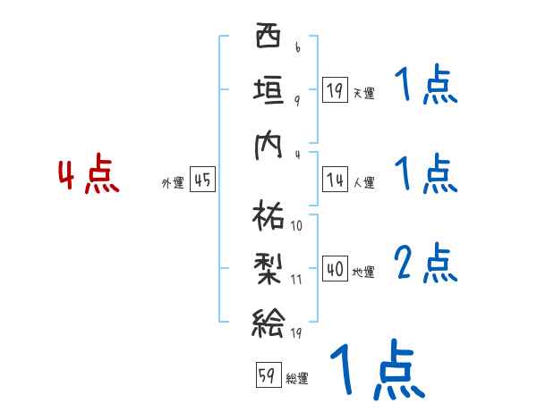 外運![]() | 西垣内祐梨絵さんの外運は45画の4つ星!もくもくと物事を進め達成する。地味な努力家。 生活面を象徴する運勢です。外部から受ける影響力を表し、結婚運、家庭運や職場、環境への順応性を表します。 |