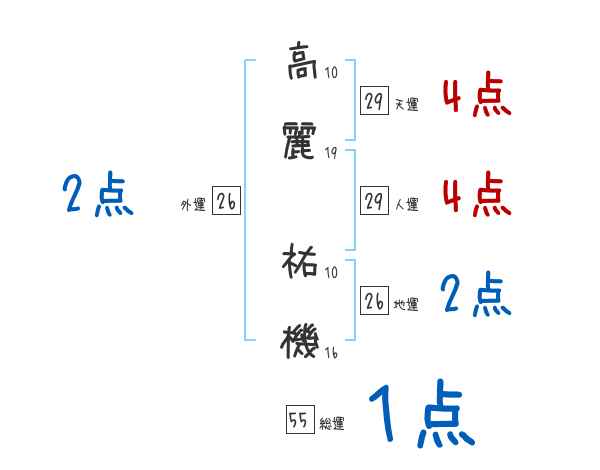 天運![]() | 高麗祐機さんの天運は29画の4つ星!完全主義で才能がある。厳格な心の持ち主。 家系が持つ宿命的な運勢を表します。祖先から受け継いだ苗字ですので自分の力が及びません。家柄を象徴します。 |