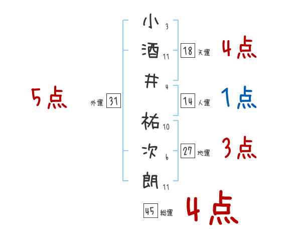 総運![]() | 小酒井祐次朗さんの総運は45画の4つ星!もくもくと物事を進め達成する。地味な努力家。 あなたの人生を表す1番重要な運勢です。生涯を通じて影響する総合運となり、主に50歳以降の晩年期に影響を及ぼします。 |