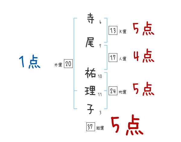 総運![]() | 寺尾祐理子さんの総運は37画の5つ星!努力家で順応性に優れる。現実的な考え方ができ忠実に物事をこなす。 あなたの人生を表す1番重要な運勢です。生涯を通じて影響する総合運となり、主に50歳以降の晩年期に影響を及ぼします。 |