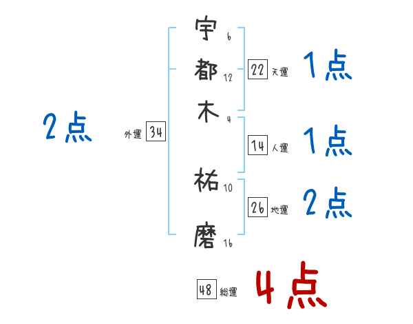 天運![]() | 宇都木祐磨さんの天運は22画の1つ星!努力することが苦手ないっぽう手先が器用。芸術性にも優れる。 家系が持つ宿命的な運勢を表します。祖先から受け継いだ苗字ですので自分の力が及びません。家柄を象徴します。 |