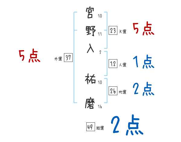 天運![]() | 宮野入祐磨さんの天運は23画の5つ星!想像力に優れ活力がある。一代で成功し名誉を手に入れる。 家系が持つ宿命的な運勢を表します。祖先から受け継いだ苗字ですので自分の力が及びません。家柄を象徴します。 |
