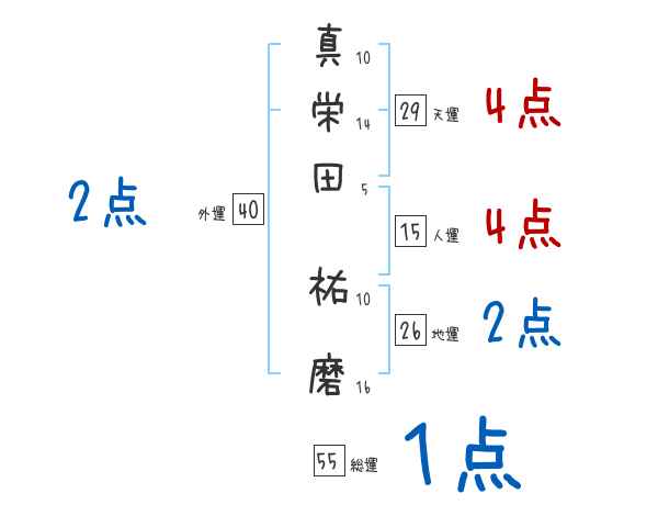 天運![]() | 真栄田祐磨さんの天運は29画の4つ星!完全主義で才能がある。厳格な心の持ち主。 家系が持つ宿命的な運勢を表します。祖先から受け継いだ苗字ですので自分の力が及びません。家柄を象徴します。 |