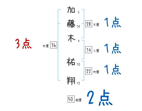 外運![]() | 加藤木祐翔さんの外運は36画の3つ星!先見性が豊かです。多少神経質で苦労することも。 生活面を象徴する運勢です。外部から受ける影響力を表し、結婚運、家庭運や職場、環境への順応性を表します。 |