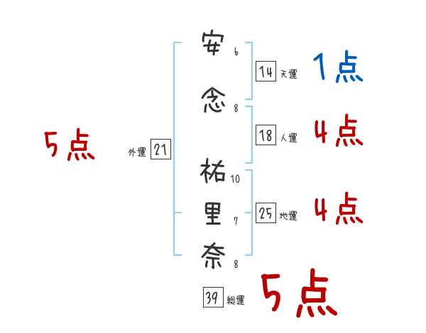 外運![]() | 安念祐里奈さんの外運は21画の5つ星!統率力がある。独立し成功する。名誉を手に入れる。 生活面を象徴する運勢です。外部から受ける影響力を表し、結婚運、家庭運や職場、環境への順応性を表します。 |