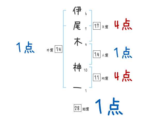総運![]() | 伊尾木神一さんの総運は28画の1つ星!家庭環境に注意。スポーツで活躍できる能力があるかも。 あなたの人生を表す1番重要な運勢です。生涯を通じて影響する総合運となり、主に50歳以降の晩年期に影響を及ぼします。 |