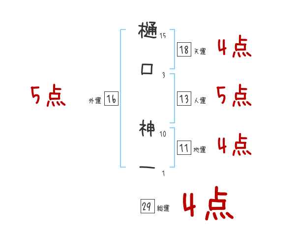 天運![]() | 樋口神一さんの天運は18画の4つ星!情熱的で剛気。忍耐力があり信頼される。 家系が持つ宿命的な運勢を表します。祖先から受け継いだ苗字ですので自分の力が及びません。家柄を象徴します。 |