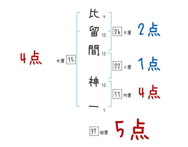 天運![]() | 比留間神一さんの天運は26画の2つ星!波瀾万丈かも。信頼できる人を大事にしましょう。 家系が持つ宿命的な運勢を表します。祖先から受け継いだ苗字ですので自分の力が及びません。家柄を象徴します。 |