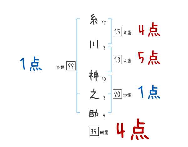 総運![]() | 糸川神之助さんの総運は35画の4つ星!温厚な性格で感受性が高い。穏和な性格で人望が厚い。 あなたの人生を表す1番重要な運勢です。生涯を通じて影響する総合運となり、主に50歳以降の晩年期に影響を及ぼします。 |