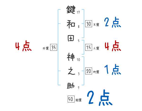 天運![]() | 鍵和田神之助さんの天運は30画の2つ星!浮き沈みの激しさに注意しましょう。 家系が持つ宿命的な運勢を表します。祖先から受け継いだ苗字ですので自分の力が及びません。家柄を象徴します。 |