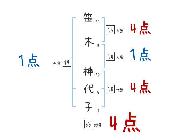 外運![]() | 笹木神代子さんの外運は19画の1つ星!優れた才能を持ちますが、協調性が足りないことも。周りの人と協力する事を意識しましょう。 生活面を象徴する運勢です。外部から受ける影響力を表し、結婚運、家庭運や職場、環境への順応性を表します。 |