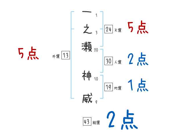 天運![]() | 一之瀬神威さんの天運は24画の5つ星!家庭運が良く順調な人生。金運にも恵まれる。 家系が持つ宿命的な運勢を表します。祖先から受け継いだ苗字ですので自分の力が及びません。家柄を象徴します。 |