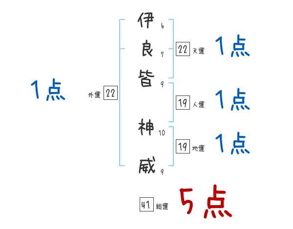 天運![]() | 伊良皆神威さんの天運は22画の1つ星!努力することが苦手ないっぽう手先が器用。芸術性にも優れる。 家系が持つ宿命的な運勢を表します。祖先から受け継いだ苗字ですので自分の力が及びません。家柄を象徴します。 |
