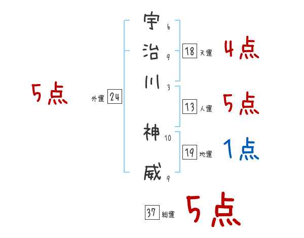 天運![]() | 宇治川神威さんの天運は18画の4つ星!情熱的で剛気。忍耐力があり信頼される。 家系が持つ宿命的な運勢を表します。祖先から受け継いだ苗字ですので自分の力が及びません。家柄を象徴します。 |