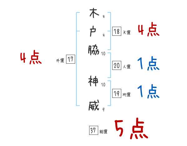 外運![]() | 木戸脇神威さんの外運は17画の4つ星!積極的な行動力。地位を気づき財産を手に入れる。純粋な心と直感力。 生活面を象徴する運勢です。外部から受ける影響力を表し、結婚運、家庭運や職場、環境への順応性を表します。 |