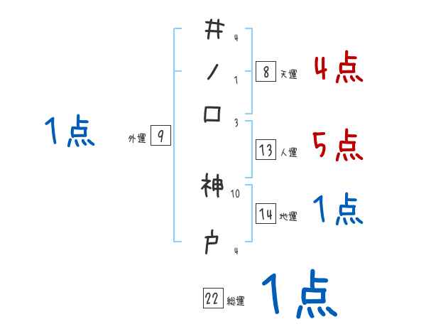 人運![]() | 井ノ口神戸さんの人運は13画の5つ星!才能に恵まれ人気がある。名声を手に入れる。円満な人生。 性格や才能などを表す2番目に重要な運勢です。人間関係や協調性、社会的な成功に影響します。主に20歳から50歳ぐらいまでの中年期の運勢を表します。 |