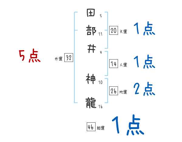外運![]() | 田部井神龍さんの外運は32画の5つ星!柔軟性があり成功する。チャンスが多く金運が良い。 生活面を象徴する運勢です。外部から受ける影響力を表し、結婚運、家庭運や職場、環境への順応性を表します。 |