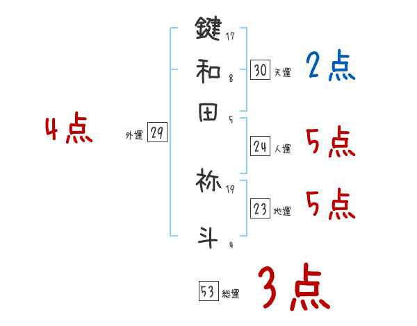 総運![]() | 鍵和田祢斗さんの総運は53画の3つ星!やや見栄っ張りで虚栄心がある。散財に注意。 あなたの人生を表す1番重要な運勢です。生涯を通じて影響する総合運となり、主に50歳以降の晩年期に影響を及ぼします。 |