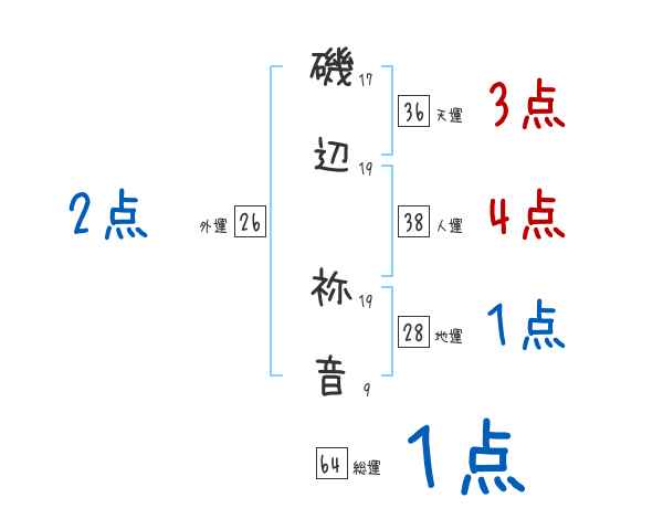 外運![]() | 磯辺祢音さんの外運は26画の2つ星!波瀾万丈かも。信頼できる人を大事にしましょう。 生活面を象徴する運勢です。外部から受ける影響力を表し、結婚運、家庭運や職場、環境への順応性を表します。 |