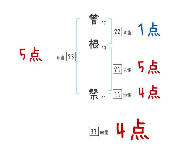 天運![]() | 曾根祭さんの天運は22画の1つ星!努力することが苦手ないっぽう手先が器用。芸術性にも優れる。 家系が持つ宿命的な運勢を表します。祖先から受け継いだ苗字ですので自分の力が及びません。家柄を象徴します。 |