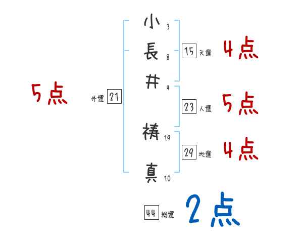 総運![]() | 小長井祷真さんの総運は44画の2つ星!誠実で慎重な性格。物事を考えすぎないように注意しましょう。 あなたの人生を表す1番重要な運勢です。生涯を通じて影響する総合運となり、主に50歳以降の晩年期に影響を及ぼします。 |