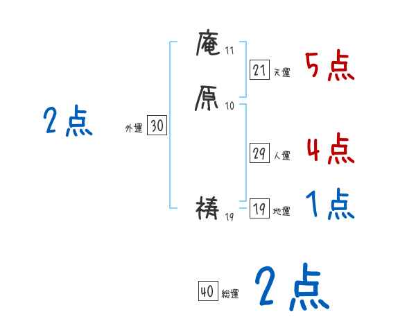 天運![]() | 庵原祷さんの天運は21画の5つ星!統率力がある。独立し成功する。名誉を手に入れる。 家系が持つ宿命的な運勢を表します。祖先から受け継いだ苗字ですので自分の力が及びません。家柄を象徴します。 |