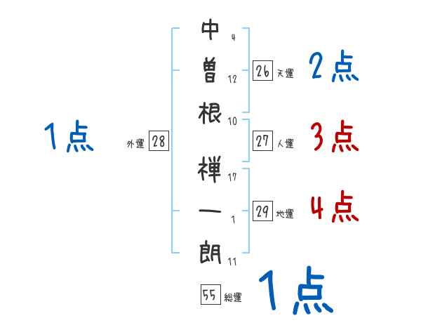 外運![]() | 中曽根禅一朗さんの外運は28画の1つ星!家庭環境に注意。スポーツで活躍できる能力があるかも。 生活面を象徴する運勢です。外部から受ける影響力を表し、結婚運、家庭運や職場、環境への順応性を表します。 |