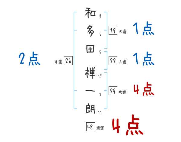 外運![]() | 和多田禅一朗さんの外運は26画の2つ星!波瀾万丈かも。信頼できる人を大事にしましょう。 生活面を象徴する運勢です。外部から受ける影響力を表し、結婚運、家庭運や職場、環境への順応性を表します。 |