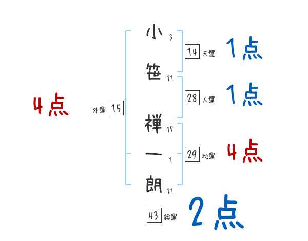 天運![]() | 小笹禅一朗さんの天運は14画の1つ星!人に対して優しいがストレスを溜め込みがち。人間関係のトラブルを避けるよう気をつけましょう。 家系が持つ宿命的な運勢を表します。祖先から受け継いだ苗字ですので自分の力が及びません。家柄を象徴します。 |