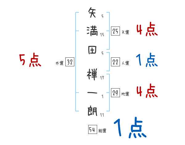 外運![]() | 矢満田禅一朗さんの外運は32画の5つ星!柔軟性があり成功する。チャンスが多く金運が良い。 生活面を象徴する運勢です。外部から受ける影響力を表し、結婚運、家庭運や職場、環境への順応性を表します。 |