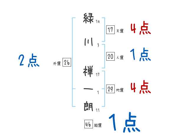 外運![]() | 緑川禅一朗さんの外運は26画の2つ星!波瀾万丈かも。信頼できる人を大事にしましょう。 生活面を象徴する運勢です。外部から受ける影響力を表し、結婚運、家庭運や職場、環境への順応性を表します。 |