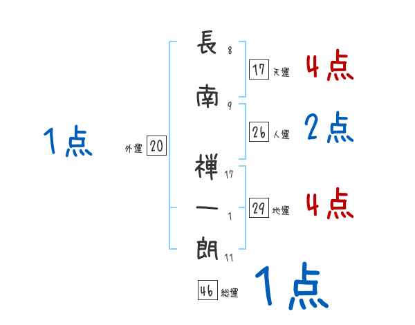 天運![]() | 長南禅一朗さんの天運は17画の4つ星!積極的な行動力。地位を気づき財産を手に入れる。純粋な心と直感力。 家系が持つ宿命的な運勢を表します。祖先から受け継いだ苗字ですので自分の力が及びません。家柄を象徴します。 |