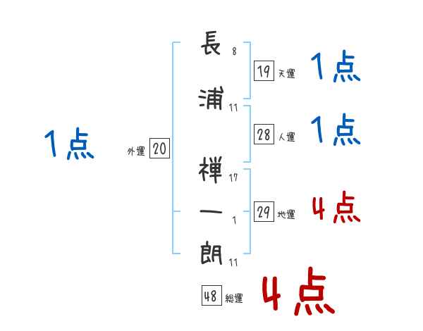 人運![]() | 長浦禅一朗さんの人運は28画の1つ星!家庭環境に注意。スポーツで活躍できる能力があるかも。 性格や才能などを表す2番目に重要な運勢です。人間関係や協調性、社会的な成功に影響します。主に20歳から50歳ぐらいまでの中年期の運勢を表します。 |