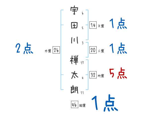 天運![]() | 宇田川禅太朗さんの天運は14画の1つ星!人に対して優しいがストレスを溜め込みがち。人間関係のトラブルを避けるよう気をつけましょう。 家系が持つ宿命的な運勢を表します。祖先から受け継いだ苗字ですので自分の力が及びません。家柄を象徴します。 |