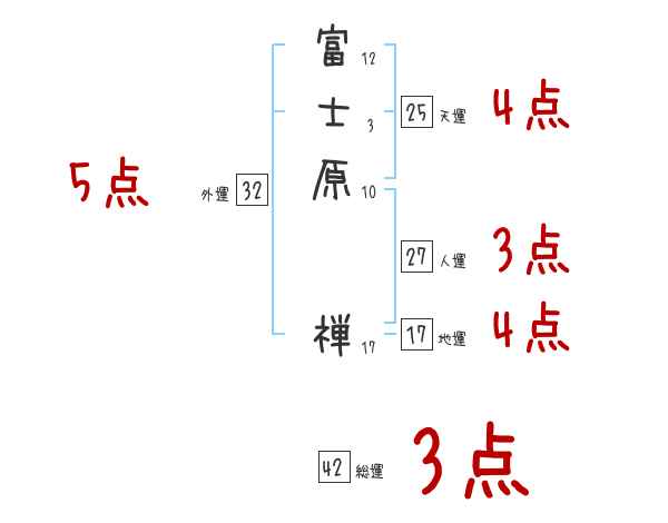 外運![]() | 富士原禅さんの外運は32画の5つ星!柔軟性があり成功する。チャンスが多く金運が良い。 生活面を象徴する運勢です。外部から受ける影響力を表し、結婚運、家庭運や職場、環境への順応性を表します。 |
