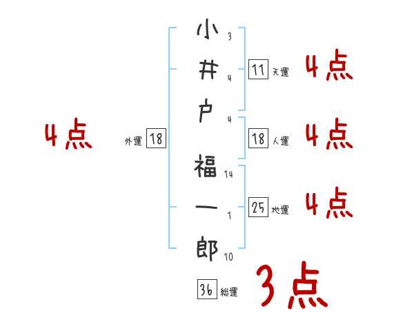 天運![]() | 小井戸福一郎さんの天運は11画の4つ星!着実に富や地位を得る幸運な人生。 家系が持つ宿命的な運勢を表します。祖先から受け継いだ苗字ですので自分の力が及びません。家柄を象徴します。 |
