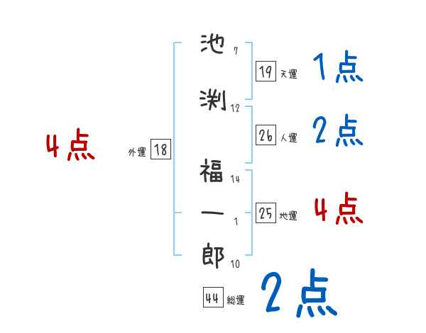 総運![]() | 池渕福一郎さんの総運は44画の2つ星!誠実で慎重な性格。物事を考えすぎないように注意しましょう。 あなたの人生を表す1番重要な運勢です。生涯を通じて影響する総合運となり、主に50歳以降の晩年期に影響を及ぼします。 |