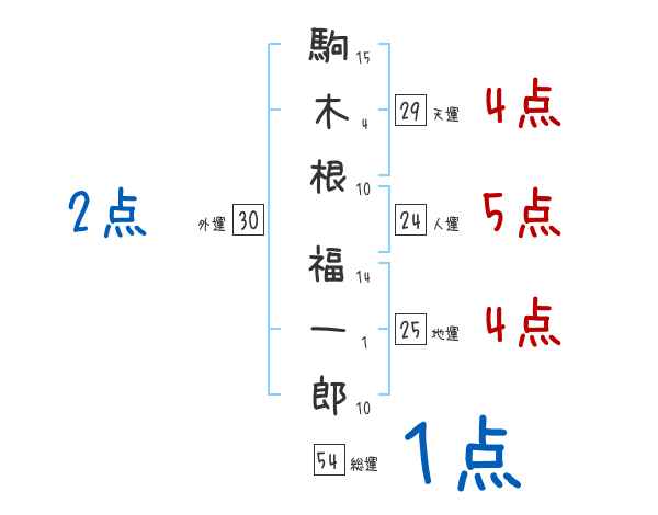 総運![]() | 駒木根福一郎さんの総運は54画の1つ星!トラブルが多いかも。周りをよく見て協調して過ごしましょう。 あなたの人生を表す1番重要な運勢です。生涯を通じて影響する総合運となり、主に50歳以降の晩年期に影響を及ぼします。 |
