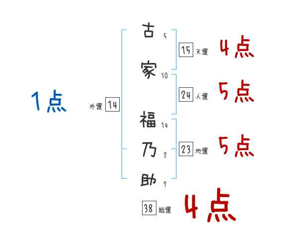 総運![]() | 古家福乃助さんの総運は38画の4つ星!温厚な性格で技術的な才能を発揮する。職人的な仕事に向いている。 あなたの人生を表す1番重要な運勢です。生涯を通じて影響する総合運となり、主に50歳以降の晩年期に影響を及ぼします。 |