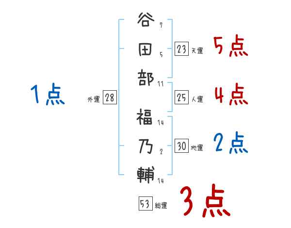 天運![]() | 谷田部福乃輔さんの天運は23画の5つ星!想像力に優れ活力がある。一代で成功し名誉を手に入れる。 家系が持つ宿命的な運勢を表します。祖先から受け継いだ苗字ですので自分の力が及びません。家柄を象徴します。 |
