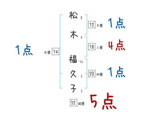 総運![]() | 松木福久子さんの総運は32画の5つ星!柔軟性があり成功する。チャンスが多く金運が良い。 あなたの人生を表す1番重要な運勢です。生涯を通じて影響する総合運となり、主に50歳以降の晩年期に影響を及ぼします。 |