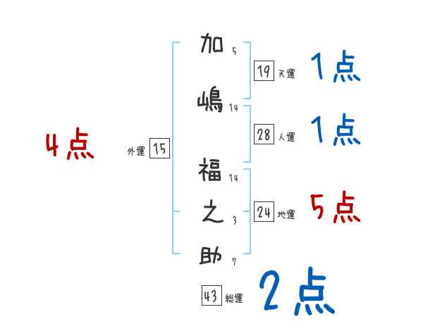 人運![]() | 加嶋福之助さんの人運は28画の1つ星!家庭環境に注意。スポーツで活躍できる能力があるかも。 性格や才能などを表す2番目に重要な運勢です。人間関係や協調性、社会的な成功に影響します。主に20歳から50歳ぐらいまでの中年期の運勢を表します。 |