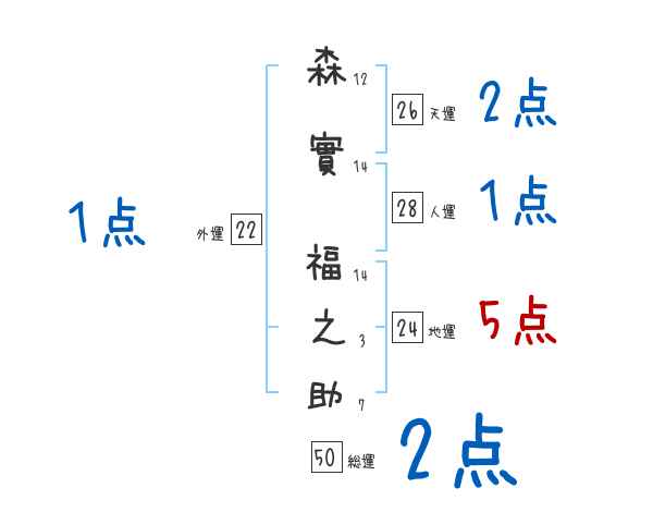 外運![]() | 森實福之助さんの外運は22画の1つ星!努力することが苦手ないっぽう手先が器用。芸術性にも優れる。 生活面を象徴する運勢です。外部から受ける影響力を表し、結婚運、家庭運や職場、環境への順応性を表します。 |
