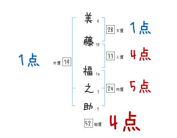 外運![]() | 美藤福之助さんの外運は19画の1つ星!優れた才能を持ちますが、協調性が足りないことも。周りの人と協力する事を意識しましょう。 生活面を象徴する運勢です。外部から受ける影響力を表し、結婚運、家庭運や職場、環境への順応性を表します。 |