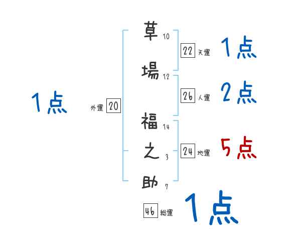 | 人運  | 草場福之助さんの人運は26画の2つ星!波瀾万丈かも。信頼できる人を大事にしましょう。性格や才能などを表す2番目に重要な運勢です。人間関係や協調性、社会的な成功に影響します。主に20歳から50歳ぐらいまでの中年期の運勢を表します。 |