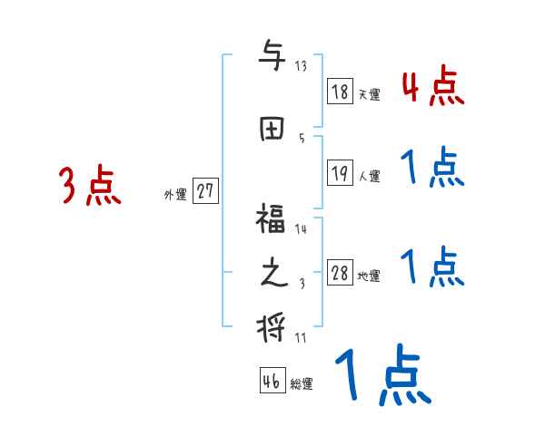 天運![]() | 与田福之将さんの天運は18画の4つ星!情熱的で剛気。忍耐力があり信頼される。 家系が持つ宿命的な運勢を表します。祖先から受け継いだ苗字ですので自分の力が及びません。家柄を象徴します。 |