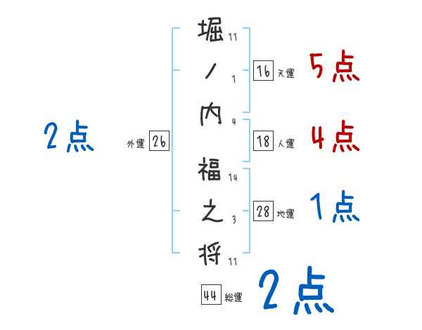 天運![]() | 堀ノ内福之将さんの天運は16画の5つ星!人望が厚く大きく発展する。逆転成功が見える。 家系が持つ宿命的な運勢を表します。祖先から受け継いだ苗字ですので自分の力が及びません。家柄を象徴します。 |
