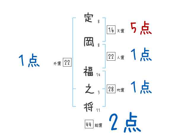 人運![]() | 定岡福之将さんの人運は22画の1つ星!努力することが苦手ないっぽう手先が器用。芸術性にも優れる。 性格や才能などを表す2番目に重要な運勢です。人間関係や協調性、社会的な成功に影響します。主に20歳から50歳ぐらいまでの中年期の運勢を表します。 |