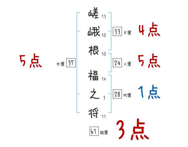 人運![]() | 嵯峨根福之将さんの人運は24画の5つ星!家庭運が良く順調な人生。金運にも恵まれる。 性格や才能などを表す2番目に重要な運勢です。人間関係や協調性、社会的な成功に影響します。主に20歳から50歳ぐらいまでの中年期の運勢を表します。 |