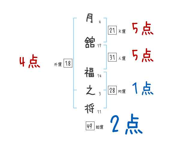 天運![]() | 月舘福之将さんの天運は21画の5つ星!統率力がある。独立し成功する。名誉を手に入れる。 家系が持つ宿命的な運勢を表します。祖先から受け継いだ苗字ですので自分の力が及びません。家柄を象徴します。 |